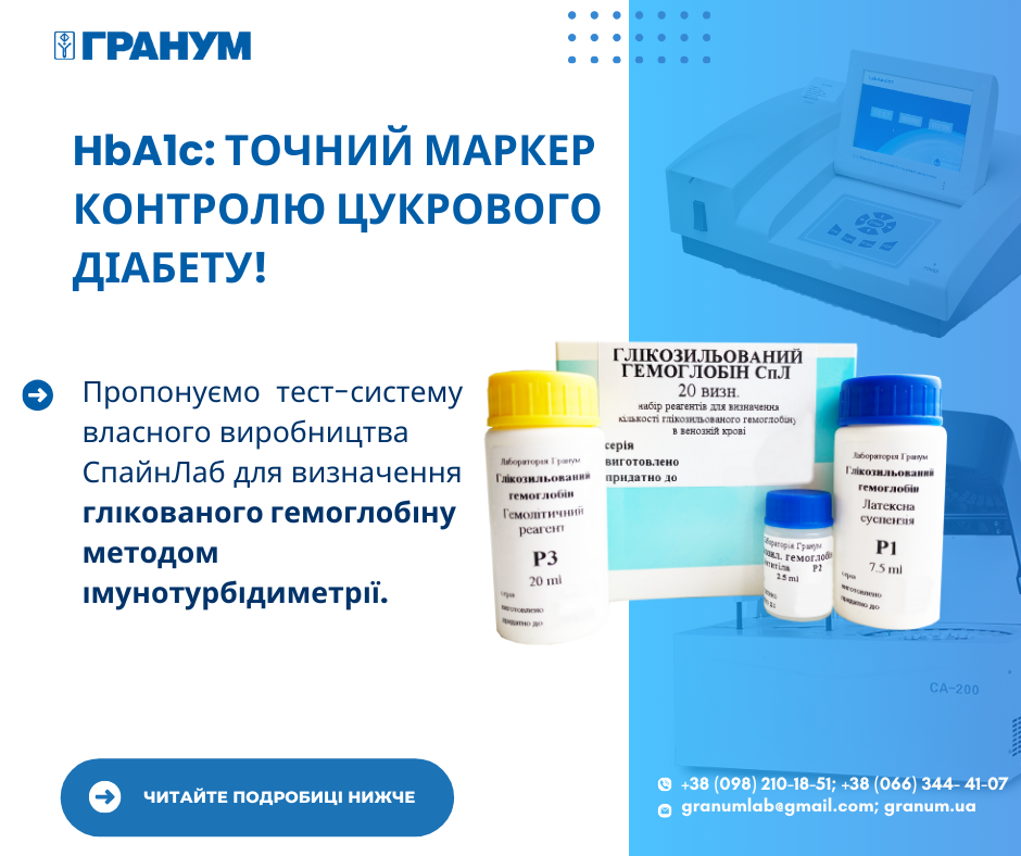 Ми пропонуємо тест-системи власного виробництва СпайнЛаб для визначення глікованого гемоглобіну методом імунотурбідиметрії.